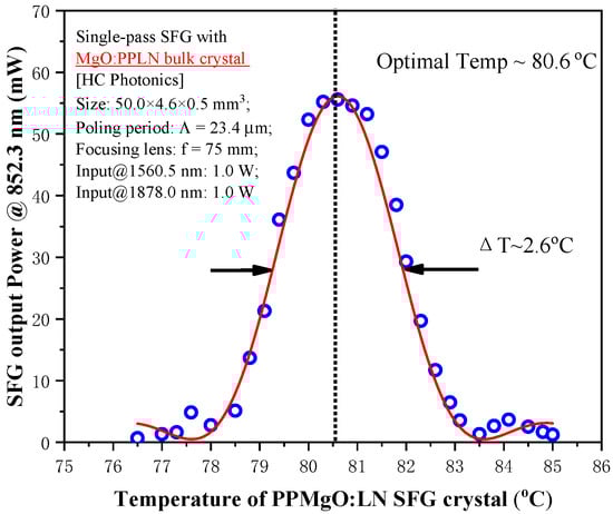 Then, in a single-pass SFG experiment, we find the optimized phase matching by adjusting the temperature of the PPMgO:LN crystal. When the power of fundamental-wave 1560.5 nm and 1878.0 nm lasers are both 1.0 W, the best phase matching of the PPMgO:LN-crystal is achieved at a temperature of 80.6 °C. The results are shown in Figure 6.