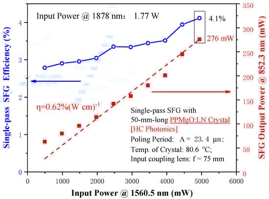 The results of SFG output power and efficiency are shown in Figure 7. The power of the 1878.0 nm and 1560.5 nm lasers are 1.77 W and 4.94 W, respectively; 276 mW of the 852.3 nm laser can be obtained, and the corresponding optical–optical conversion efficiency is 4.1%. Fitting to the data of the linear region yields a nonlinear conversion efficiency of 0.62% (W cm) −1. The SFG nonlinear conversion efficiency can be written as [23]
