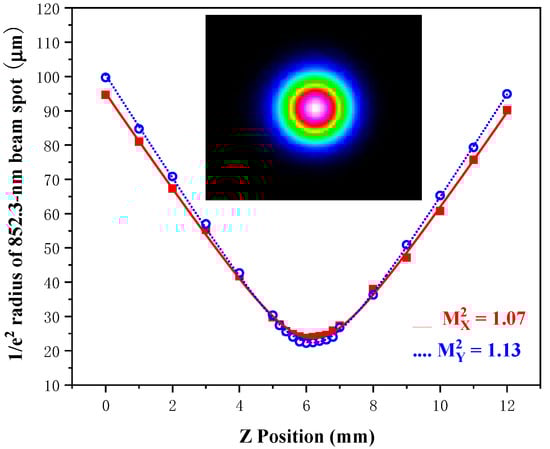 The transverse beam quality of 852.3 nm laser is evaluated by using the beam quality factor parameter () in the two orthogonal transverse directions X and Y. Figure 8 shows the 1/e2 beam radius versus the axial position Z using a plano-convex lens with a focal length of 50 mm. Fitting of the experimental data gives = 1.07 and = 1.13.