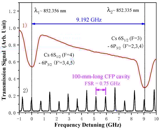 The trace (1) shows the D2 line absorption spectra of 6S1/2–6P3/2 transition of cesium atoms by using SFG laser at 852.3 nm, while the 1560.5 nm fundamental-wave laser is frequency-scanned linearly, but the 1878.0 nm fundamental-wave laser’s frequency is fixed. Frequency scanned 852.3 nm laser beam is monitored using a confocal Fabry–Perot cavity with free spectral range (FSR) of 0.75 GHz as shown by the trace (2). Clearly the continuously tunable range of the 852.3 nm laser’s frequency is more than 9.2 GHz.