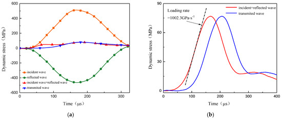 Curves of loads versus time (a) The dynamic stress curves detected from the incident bar and transmitted bar. (b) Determination method of the loading rate.