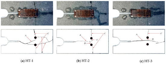 Figure 5 presents three typical crack propagation patterns of specimens in the experiment. The crack propagation paths on the specimen HT-1, HT-2, and HT-3 in Figure 5 were in a straight line before the running crack reached the two holes’ zone, where two empty holes were deployed, which accorded with the feature of mode I of fracture. As the running cracks went across the two holes area, the surfaces of two empty holes were damaged at different levels, with secondary cracks appearing around the two empty holes. The microstructure of the rock material played a crucial role in dominating the crack initiation and propagation, helping the running crack behave as shown above. It was found that the crack path would stay in the middle of the specimen if the rock material were homogeneous, as Figure 5b,c showed, or the crack path might perform as in Figure 5a. The crucial phenomenon related to this experiment is the dramatic change in crack propagation direction at the moment that the running crack drives into the two hole zone.