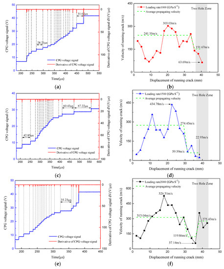 As mentioned above, the running cracks on specimens performed similarly; the deceleration phenomenon appeared when the crack drove into the two hole zone, and arrest occurred in the propagation process. Moreover, judging from Figure 6, the average velocity and the maximum velocity of running crack were increased with the enhancement of the loading rate. It is prominent that the phenomenon in which the speed of running crack decayed rapidly appeared earlier with a rise in loading rate.