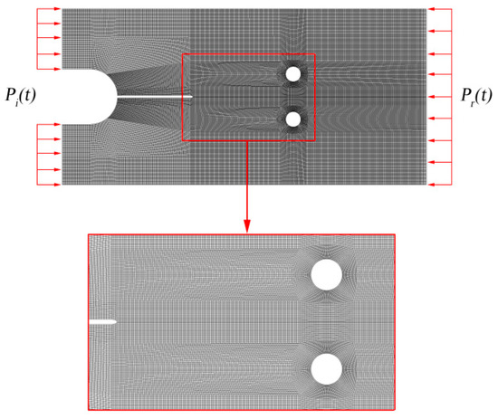 Figure 7 shows the numerical simulation model of ISCSC specimens, established according to the geometric dimension in Figure 2. With reference to the results of the experiment, three crucial areas are focused on as their meshes are specially designed and elaborately divided. Two rows of elements with length 0.1 mm were deployed from the pre-crack tip, along with the predicted crack propagation path to the bottom of the specimen, to realize randomness of crack initiation as well as to simulate crack propagation path precisely. Meanwhile, a relatively fine mesh was generated in the two hole area to monitor the change of the stress field in this area. The material parameters and loads applied in this simulation are based on the measured results from the experiment, as shown in Figure 4 and Table 1.