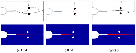 Despite the points discussed above, the fracture phenomenon in the specimens, where the running crack rushes directly into the hole below (shown by HT-1 in Figure 5a), is hardly reproduced by the numerical simulation. This is because the sandstone employed in the experiment is not the perfect homogeneous material which contains many irregular fissures and particles, offering a lot of tunneling opportunities when the cracks initiate and propagate. During the propagation process, the running crack might deviate from the symmetry axis of the specimen and approach the hole, resulting in the influence of the hole leading the running crack to rush directly into the hole. However, the material given in the numerical simulation is the ideal homogeneous material, so the cracks could run straight along the symmetry axis of the specimen, leaving no chance for the running crack to approach the hole.