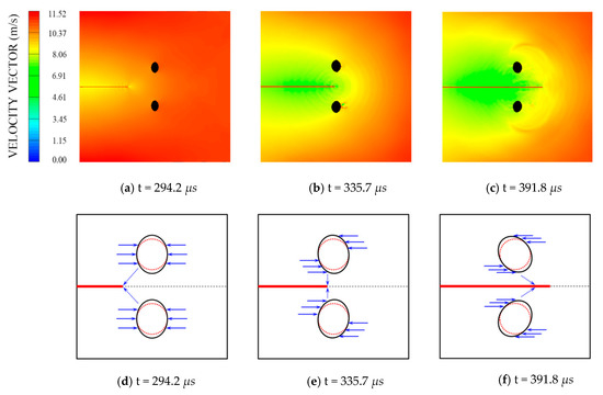 Figure 10 shows three significant moments of the process, where main cracks cross the two hole zone, with their particle velocity vector contour plotted. When t = 294.2 μs, the main crack tip arrives in front of the two hole zone with a very high speed, and then velocity declines immediately, according to previous analysis. From Figure 10a, it is evident that the surface of the two empty holes has a distinct deformation, transforming the circle to an ellipse, as shown in Figure 10d. This is because, when the incident stress wave arrives in the two hole area, the stress wave reflects on the front surfaces of the holes’ shaping reflected tensile wave, and the compressive wave reflected from the bottom of the specimen works on the back surfaces of the holes. These contribute to the deformation of the two holes. It is the deformation of the two empty holes that prompts the particles between two holes to move toward the symmetric axle of the specimen and shapes a compressive stress field between them. This compressive stress field plays a crucial role in reducing the velocity of the running crack.
