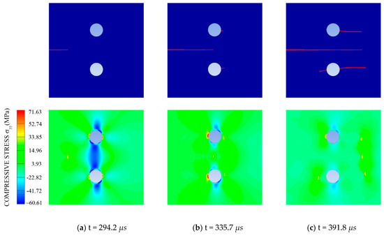 As the dynamic crack propagation continues, the free surface of the dynamic crack collaborates with the boundary of two empty holes, reshapes stress wave distribution, and results in transforming the curvature of ellipse shown in Figure 10e,f, which, in response, causes the direction of particles moving between two holes to change with time and leads the compressive stress field to have different effects on the running crack. For instance, when t = 335.7 μs, the compressive stress field has a strong impact on the arresting running crack, during which the running crack may stop, as HT-2 in Figure 5b shows. However, when t = 391.8 μs, this stress field might facilitate crack propagation, enhancing the velocity of the running crack, with Figure 9a providing evidence that the crack propagation speed increases after the running crack goes across the two holes’ zone. Also, the compressive stress contour is extracted from numerical simulation and plotted in Figure 11 with the dynamic crack path at the corresponding time.