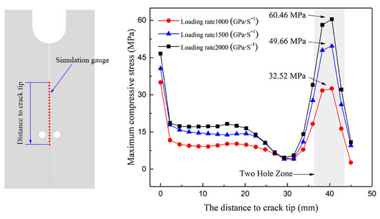 According to the compressive stress curves in Figure 12, it can be concluded that the intensity of compressive stress in the two hole zone is much greater than the rest of the gauge points during the stress wave’s progress in the specimen, and the maximum compressive stress appears at the center of the holes. Particularly, the maximum compressive stress monitored by gauges presents an entire increase tendency with the increase in loading rate. The maximum compressive stresses under loading rate are 1000 GPa·s−1, 1500 GPa·s−1 and 2000 GPa·s−1 are 32.52 MPa, 49.66 MPa, and 60.46 MPa, respectively. Therefore, the compressive stress field demonstrates a more powerful influence on crack propagation when the loading rate becomes higher. This can explain the different behaviors that a dynamic crack shows when it is subjected to different loading rates.