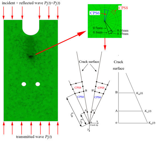 In order to obtain the SIF, ABAQUS finite element software, whose computational accuracy is well proved, was applied. The capability and convergence of this finite element model were validated by many research works relevant to different types of constructional materials [10,36,37,38,39,40]. In Zhou’s work [32], the calculation of DSIF by ABAQUS was compared with classic benchmark Chen [41] problem, which demonstrated a good agreement. Therefore, the ISCSC simulation specimens were established with actual size assembled with mechanical parameters from Table 1 and three loading rates (1000 GPa·s−1, 1500 GPa·s−1, and 2000 GPa·s−1) were applied in the numerical simulation. The crack tip was meshed with CPS6 elements (quarter-point triangular elements), while CPS8 elements (quadrilateral element) were deployed for the rest of the region. In the six-node triangular element, rOA = rOB/4. The grids of the specimen were generated randomly and controlled by the global mesh size 1 mm, while the grids around the crack tip were specially split with sizes shown in Figure 13. The total 40,862 elements were employed in simulation, so that the calculation results could be guaranteed, as shown in Figure 13. In addition, the mode of crack initiation of the ISCSC specimen is pure mode I, and it has been verified [31].