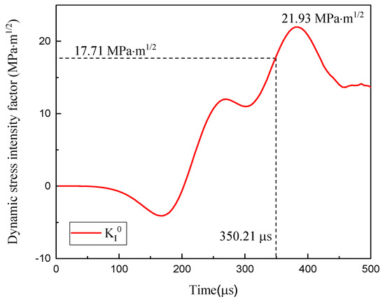Figure 14 demonstrates the determination method of the propagation of DSIF. As the curve of dynamic SIF versus time at the crack tip has been obtained by calculation results from ABAQUS, the critical DSIF is determined by the fracture time recorded from the crack propagation gauge in the experiment. Then, the determined KI0(t) and the corresponding velocity is substituted into Equations (11) and (12), and the propagation DSIF, KId(t), can be acquired.
