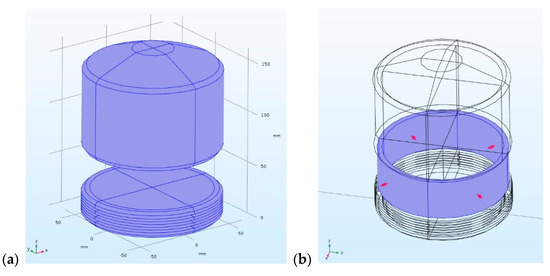 The lamp has a cylindrical shape of a maximal radius equal to 54.47 mm. The simplified numerical model of the lamp consists of two heat sinks made of aluminum covered with paint (see Figure 2a) and a transparent, light-transmittable cylinder made of acrylic plastic (plexiglass) of 5 mm width (see Figure 2b). The LEDs emitting light are installed on a printed circuit board at the surface of the bottom heat sink, while the stabilizers and other elements of the power supply system are mounted inside the top heat sink. The theoretical model assumes that the heat produced by the LEDs and stabilizers is evenly distributed over the area directly adjacent to the heat sink; therefore, we define a surface heat source for the LEDs and stabilizer, as depicted in Figure 2c. For the outer edge of the computational domain, we assume a constant ambient temperature, while the tunnel floor is assumed to be thermally insulated (see Figure 2d).