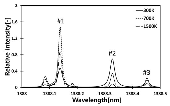The intrinsic absorption wavelengths of H2O, near 1388 nm, were used for temperature sensitivity measurements of the combustion environments. Figure 1 shows the absorption spectrum of H2O in the near-infrared region (1388 nm), which has been calculated by the HITRAN database [21]. Three absorption lines located at 1388.139 nm (#1), 1388.328 nm (#2), and 1388.454 nm (#3) have remarkable temperature dependence at three different temperatures (300 K, 700 K, 1500 K), and they were utilized for temperature measurements.