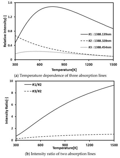 Figure 2a shows the theoretical absorption intensity variations of three dominant wavelengths (#1, #2, #3) for temperature variations of H2O. Figure 2b represents the temperature dependency of the ratios of the three dominant wavelengths. It can be said that the ratio of #1/#2 has a strong linearity for temperature increments. In the CT process, this linearity is utilized for temperature calculations, in which the calculation errors between the temperature obtained from the theoretical absorption spectra and the temperature obtained from the experimental absorption spectra.