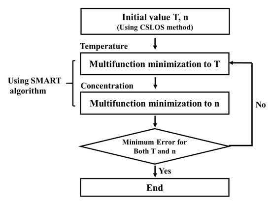 Once the initial absorption spectra are obtained by the use of SLOS and CSLOS, the absorption coefficients represented by Equation (3) are calculated iteratively until the differences between the theoretical absorbance and the experimental absorbance using the MSE (mean square error) function as shown in Equation (6) are minimized so that the final temperature and concentration are decided. During iterative calculations, all theoretical spectra were normalized with maximum intensity.