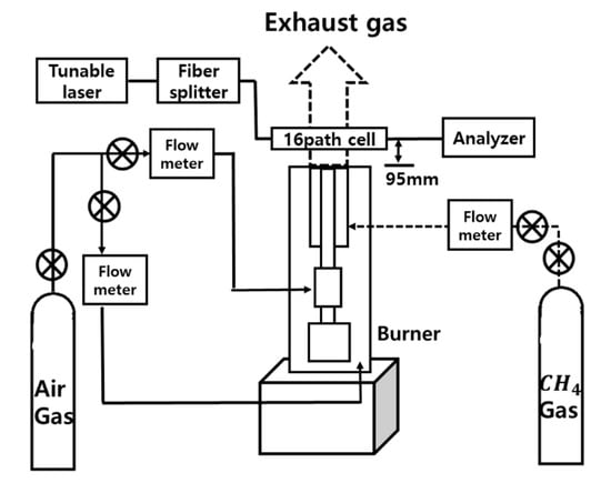 Figure 5 shows the experimental setup. The absorption spectra of H2O in a flame burner have been measured. The burner has a double-tube structure composed of a sintered bronze filter and external piping. Methane (CH4) gas has been used as fuel and it has been mixed with air supplied through a sintered bronze filter. The diameter of the main burner tube is 6 mm. The 16 path CT-TDLAS measurement cells as shown in Figure 6 have been set at the position 95 mm above the burner. The experimental parameters are summarized in Table 1.