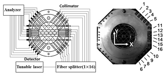 A DFB (distributed feedback) diode laser (NTT Electronics Co., NLK1E5GAAA) of which working wavelength is 1388 nm with a scanning range of 0.6 nm was used to get H2O gas absorption spectra. In order to measure simultaneous 2-dimensional absorption spectra a 16-path cell as shown in Figure 6 has been used. Laser paths have 7 mm to 12.3 mm spacing with each other for covering 2-dimensional space. The laser beam has been separated by the use of an optical fiber splitter (OPNETI CO., SMF-28e 1310 nm SWBC 1 × 16). Then, the separated 16 beams pass through 16 collimators (THORLABS Co., 50-1310-APC) to attain focused light intensity. The intensity of the transmitted light has been detected by 16 photodiodes (Hamamatsu Photonics and G8370-01), and they have scanned with 1 kHz and have been recorded onto the recorder (HIOKI E.E. Co., 8861 Memory Highcoda HD Analog16). The detected signals have been amplified using the amplifier (Stanford Research Systems, SR445A).