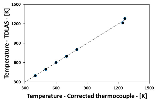 The cause of the error in TDLAS is the disagreement between the theory and experiment. The discrepancies between the original virtual data and the TDLAS calculation data are not so large, and it would be also improved by revising the theoretical spectroscopic data [22]. In addition, it is important to evaluate CT algorithm errors [18,23] together with the evaluation of these spectroscopic errors. The CT algorithm error is according to the shape of the temperature and concentration distributions, and the error tends to increase when the shape is complicated. In actual use of the optical experimental apparatus, the process of reducing the error between the theory and actual experiment is important. It is directly measured by changing the temperature and pressure of the target gas to be measured, and it can be corrected by contrast with the theoretical value. Figure 7 shows the comparisons between the temperatures measured by the TDLAS and by the thermocouple. At the temperature range of 300 K to 800 K, the absorption intensities obtained by a calibration process have been used, in which the concentration of H2O, the temperature and the pressure could be controlled in a cell [24,25]. At the temperature range higher than 800 K, the absorption intensities obtained by a flat flame burner test [22] performed under the temperature range from 1244 K to 1264 K have been used. Using these results, the HITRAN database over 800 K has been modified for the actual TDLAS calculations. It can be said that the temperature measured by the thermocouple and the temperature calculated by the TDLAS shows a good agreement, revealing high accuracy.