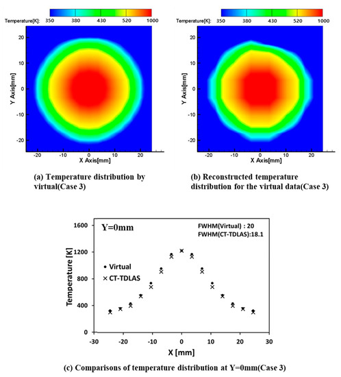 Table 2 shows the comparison of the above three values between the virtual data and the data obtained by CT-TDLAS for three different cases, of which FWHM is 10 mm, 15 mm, and 20 mm. It can be said that the SSD values for the three cases are less than 5% (13.155 K/280 K) at most. This implies that the discrepancy between the original virtual data and the data obtained by CT-TDLAS calculation is very small, showing that the present calculation approach is appropriate. Figure 9a,b shows the results of the case 3. Figure 9c shows the temperature profiles at the centerline of the calculation area for the virtual one and the CT-TDLAS calculation results.