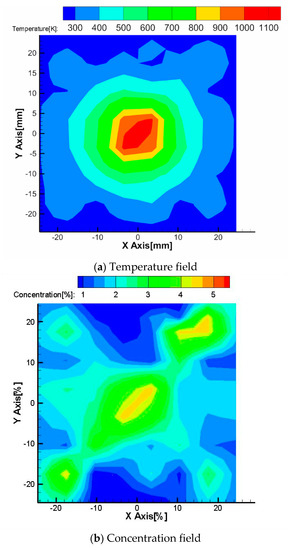Figure 12a,b shows the results obtained by the CT-TDLAS, in which the SMART algorithm has been adopted. It can be seen that the temperature distribution is similar to the distribution measured by the thermocouple as shown in Figure 10, revealing that the temperature calculated by the current approach of CT-TDLAS is validated. However, there is some irregular distribution in the concentration field. This is due to the influences of the boundary grids.