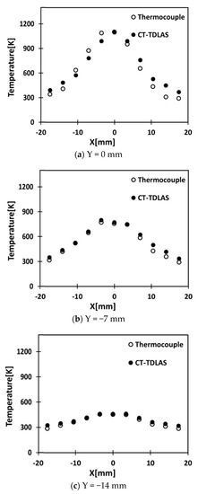 Figure 13a–c shows the comparisons of the results measured by the thermocouple and calculated by the CT-TDLAS for three different Y locations at Y = 0 mm, Y = −7 mm, and Y = −14 mm. It can be seen that the discrepancies between the temperature measured by the thermocouple and the temperature calculated by the CT-TDLAS are quite small at outside locations from the flame burner center.