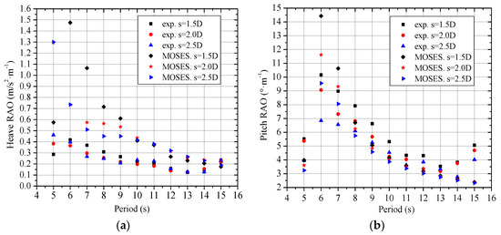 Figure 18b, the maximum amplitudes of pitch angle, smaller than the amplitudes at 4.0 m and 4.5 m draft, are 10.03° for S = 1.5D, 9.66° for S = 2.0 D, and 9.19° for S = 2.5 D. However, the pitch RAOs increase with the increase in spacing between bucket foundations, and the variation trend is contrary to the trend at a 4.0 m draft and a 4.5 m draft. The heave RAOs for S = 2.5D were much larger than those for S = 1.5D and S = 2.0 D in almost each period, i.e., the wider the spacing between bucket foundations, the larger the heave RAOs. Therefore, simply improving the pitch RAOs by increasing the spacing between bucket foundations is limited and negatively affects the motion performance during the transportation of LDTBF.
