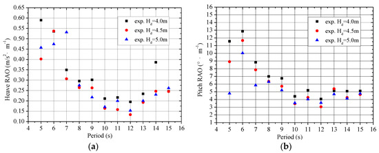 Figure 11b. The maximum amplitudes of pitch angle appearing near the period of 6 s were 10.12° at a 4.0 m draft, 10.88° at a 4.5 m draft, and 9.66° at a 5.0 m draft, respectively. The pitch responses first increased and then decreased with the increase in draft. The amplitude change for pitch angles of 5–9 s around the resonant period is significantly larger than that of 9–15 s. With a longer period, the RAOs of pitch angles were almost constant at 4.0°.