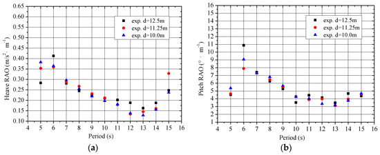 Figure 15b, a comparison of pitch RAOs with different water depths shows that an increase in the water depth slightly decreased the pitch angle. However, the maximum values of pitch RAO increased from 6.84° to 9.17° with the increase in water depth from 10.0 m to 12.5 m. A sharp fluctuation occurred around the resonant period. The reason for the fluctuation in pitch RAO can be attributed to the well-known shallow water effect: the shallower the water depth, the slower the heave and pitch motion.