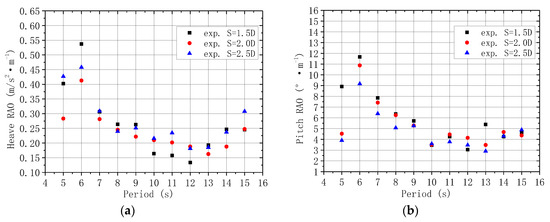 Figure 17. The maximum amplitudes of heave acceleration for S = 2.0 D are less than those of S = 1.5 D and S = 2.5 D around the resonant period. The heave RAOs with a wider spacing were slightly larger than those with a narrower spacing with the period longer than 7 s.