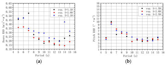 Figure 17b shows that the pitch RAOs have a similar decreasing trend as the 4.0 m draft with the increase in s. The maximum amplitudes of pitch angle, smaller than the amplitudes at 4.0 m draft, are 11.67° for S = 1.5 D, 10.88° for S = 2.0 D, and 9.17° for S = 2.5 D.