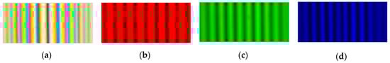 The interference pattern of white light and RGB light interference components. (a) White light interference pattern; (b) red light interference pattern; (c) green light interference pattern; (d) blue light interference pattern.
