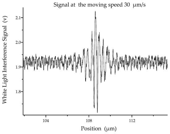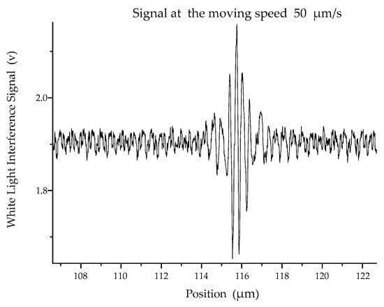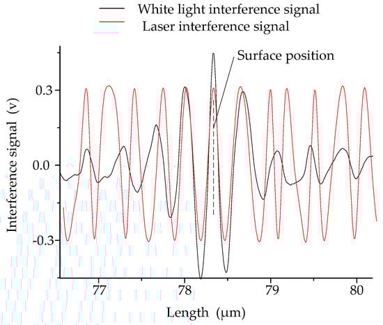 As described in Section 3, the laser interference and white light interference have respective advantages. The white light interference has surface positioning advantages for its incoherence and the laser interference has a good interference fringe because of its good coherence. The combination of two ways of interference has advantages for improving measurement results. The signal obtained by the combination of two ways of interference is shown in Figure 12.