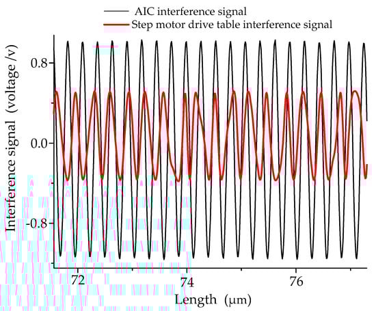 The moving stability of table is another factor to affect repeatability. Figure 10 shows the length interference signals of different motion tables. Automatic interference comparator (AIC) is a specialized length measurement with a high precision. The uniformity and smoothness of the interference signal are very good because the motion slide is driven by hydraulics [,]. The vibration from the driven unit is negligible. The motion driven part used in this paper is a step motor, and the vibration from the motor is inevitable. Then, if the driven mode changes, the uniformity and smoothness of the motion will be improved. Estimating from the measurement experience of AIC, at least 5 nm of repeatability will be reduced.