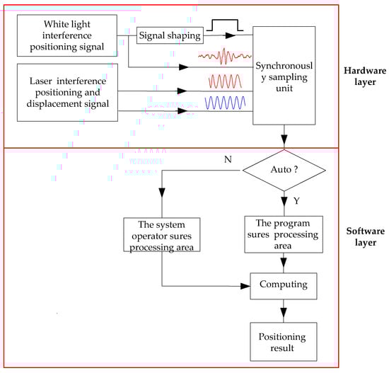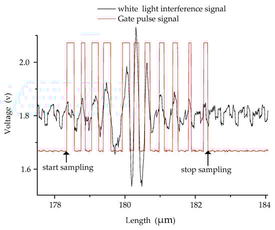 Signal processing system is also import for measurement repeatability. As seem in Figure 13, the feature of the system has both manual and automatic signal processing functions in the soft layer of the system. Every unit realizes its corresponding function. Among them, signal shaping is the basic function causing the trigging signal for synchronous sampling. Its working principle is shown in Figure 14. The white light interference fringes generate a group of pulse outputs. The rising edge of first pulse is used to start signal sampling, and the falling edge of the last pulse is used to stop signal sampling. The signal processing methods are also critical to obtain good measurement repeatability. The signal processing methods include signal smooth filtering, the positioning strategy, bidirectional measurement, and averaging the multiple measurement results, etc.