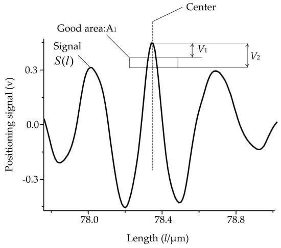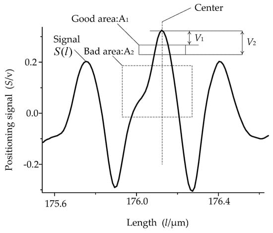 The center of the zero-order fringe in white light interference means the position of the surface. The methods to obtain the center from the positioning signal are studied. There are many kinds of methods for line scale signal processing. Generally, they are classified as two classes. One is determined by a few points to the left and right edges of the signal [], and the other is determined by multiple points to the left and right edges of the line scale signal []. Since the positioning signal of the surface is familiar to the positioning signal of the line scale, the signal processing method used for line scale is suitable for surface positioning. Due to the advantage of reliability, the multiple point method was adopted in this paper. For the multiple point method, one important step is to ensure the section of signal for processing in an appropriate section, beneficial to enhance the positioning accuracy Figure 15 and Figure 16 show the positioning signal of the first and second surface of the step tested, respectively. The section of signal to be processed was the rectangular area below the peak of signal, determined by the value V1 and V2. As showed in Figure 16, when V1 and V2 were appropriate, the area A1 was a good area, and when V1 and V2 were not appropriate, the area was the bad area A2. In the case of A1, the computed result was accurate to the center, while in the case of A2, the computed result was left to the center, causing the positioning error. In fact, there are many cases that were worse than the case of A2, so the parameters V1 and V2 should be automatically adjusted to fit different poor positioning signals. Furthermore, for more complex cases, when it is difficult to select automatically, the processing section should be decided by the system operator. After confirming the processing section of signal, the result is automatically computed as Equation (6).