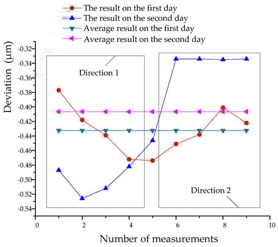 Besides the signal processing methods, the bidirectional measurement and averaging multiple measurement were adopted. The measurement experiment for the same step in two measurement directions was done in two days. In Figure 17, it is obvious that when the measurement direction was different, the result was relatively changed. On the first day, the measurement results were unsymmetrical to the direction in an approximate stair shape. On the second day, the measurement result was symmetrical to the direction in an approximate triangle shape. A system error was coupled into the measurement result, and it was changed with the time and the measurement direction. If there was no averaging, the measurement result difference was divergent and the maximum different was more than 0.7 μm. If averaging, the final result was convergent, and the difference was less than 0.03 μm.