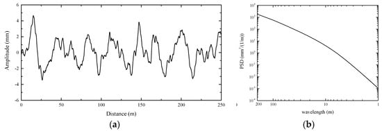 Track irregularity (a) track irregularity with distance and (b) power spectrum density (PSD) with wavelength.