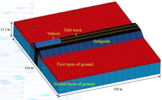 The subgrade and clay are simulated as solid elements based on the FEM theory in LS-DYNA. In order to improve the calculation efficiency, the rock is not developed in the model, and the fixed boundary is set under the bottom of the second layer of ground instead. Although LS-DYNA provides the infinite boundary options for soils such as Perfectly Matched Layers (PML) and non-reflecting boundary, they are mainly applicable for normal-dry soils without pore waters. When the soils are saturated, the infinite boundary can induce some deformations at the edge of the model in LS-DYNA. Therefore, the normal translational and rotational constraint boundary is still used, but the dimension of the model is set as 100 m × 110 m × 15.5 m to avoid the influence of reflected waves on the vibration responses of soils in the focus-area, which is the soil underneath the slab track, as shown in Figure 3.