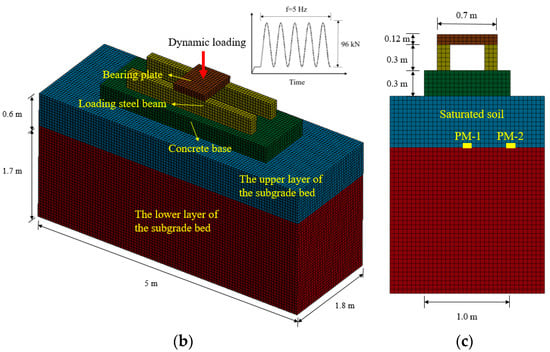 The ground vibration responses and train-track dynamic interactions obtained from the coupled train-track-soil model with dry soils have been validated in []. In order to validate the pore water pressure obtained from LS-DYNA, a numerical model with saturated soils is developed based on the lab-test model, in which the time history curves of the pore water pressure of saturated soils are obtained. The test model consists of a bearing plate, loading steel beam, concrete base, the upper layer of subgrade bed, and the lower layer of subgrade bed. The upper layer of subgrade bed is infiltrated with water to make the soil saturated. A waterproof layer between the two layers of soils is used. A dynamic load with an amplitude of 96 kN and a frequency of 5 Hz, is applied to the bearing plate. The details of this lab-test can be found from [,,,]. The lab-test model and numerical model are shown in Figure 4.
