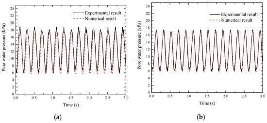 The time history curves of the pore water pressure at PM-1 and PM-2 are illustrated in Figure 5. The simulated curves exhibit a very good agreement with the shapes of experimental results, but the amplitudes show some differences. The maximum and minimum pore water pressures obtained from experimental and numerical results are shown in Table 4. There was less than an 8% difference between experimental and numerical amplitudes in all cases, indicating the pore water pressure obtained from LS-DYNA was reliable in practice. This agreement of the result is thus considered reasonably acceptable.
