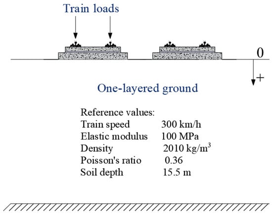 The model with the one-layered ground and the reference values of the parameters are shown in Figure 6. The dynamic responses of saturated soil under train loads are investigated and the influences of train speed and soil elastic modulus on the vibration responses are also studied from the one-layered soil model.