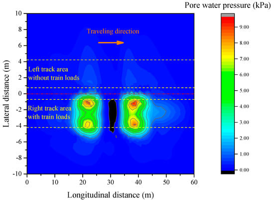 In this paper, the maximum pore water pressure occurred at the surface of the soil, as shown in Figure 9a. However, the pore water pressure at the soil surface was equal to 0 kPa in [] and the maximum pore water pressure along with depth occurred at around 2 m. In [], when the soil surface was free, the maximum pore water pressure occurred at around 2 m, but when the soil was underneath the elastic medium of the subgrade, the maximum pore water pressure occurred at the soil surface. Note that although the soils were underneath the track in [], the track simulated as beam elements, indicating the soil surface under the track was free.