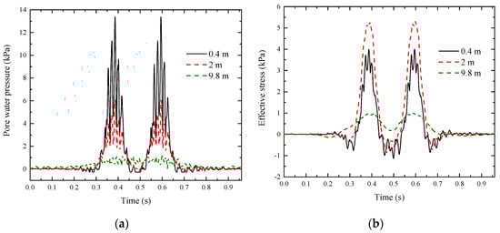 The elastic modulus of the soil increased from 10 MPa (very soft soil) to 1000 MPa (very stiff soil). The vibration responses with soil modulus at three depths are shown in Figure 10. At the surface of the soil (0.4 m), the pore water pressure was much higher than the effective stress when the soil modulus was lower than 200 MPa. In contrast, when the soil became very stiff, the effective stress was much higher than the pore water pressure, indicating that the pore water would carry the majority dynamic loads in soft soils, and the soil particles would undertake more dynamic loads in stiff soils at the soil surface. At 2 m, the pore water pressure had similar amplitudes with effective stress when the soil was soft, and the effective stress was higher than the pore water pressure for stiff soil. As for deeper soils (9.8 m), both the pore water pressure and effective stress did not change much with soil modulus. It is also noted that the effective stress at 0.4 m (surface) was lower than that at 2 m when the soil was soft (≤200 MPa), but was higher than that at 2 m when the soil became stiffer.