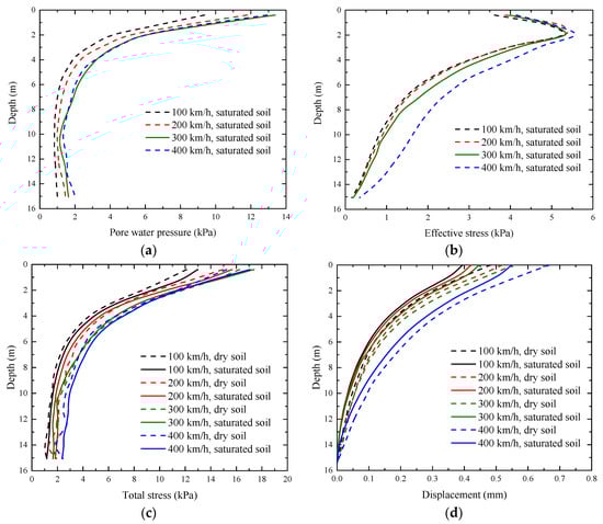 The displacement of saturated soil was lower than that of dry soil, as shown in Figure 9d. The train speed had an evident influence on the displacement. The displacement increased with train speed for both saturated and dry soils.