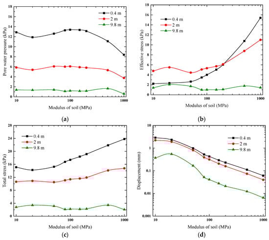 The total stresses with soil modulus at three depths are shown in Figure 10c. The values increased with soil modulus at 0.4 m and 2 m, but the modulus had no significant influence on the deeper soils (9.8 m). As for the displacement, it decreased significantly with the soil modulus at the three depths, as shown in Figure 10d.