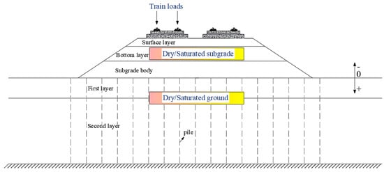 The multi-layered soils are developed based on a typical cross-section in the Beijing-Shanghai high-speed railway in China []. The subgrade consists of three layers: Surface layer, bottom layer, and subgrade body. Furthermore, the ground consists of two layers of clay and three layers of rock.