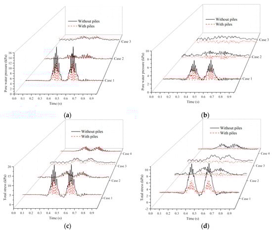 The vibration responses of pore water pressure, effective stress, total stress, and displacement without and with piles are shown in Figure 13. When the piles are not considered, the pore water pressure in case 1 was higher than that in case 2 and case 3 when the depth of ground was lower than 7 m, as shown in Figure 13a. In case 3, the pore water pressure was much higher in subgrade, but it rapidly decreased to a small constant value in the ground. When the piles were taken into consideration, the pore water pressures of ground soils in case 1, case 2, and case 3 became lower than the values in natural ground, as shown in Figure 13a,b.