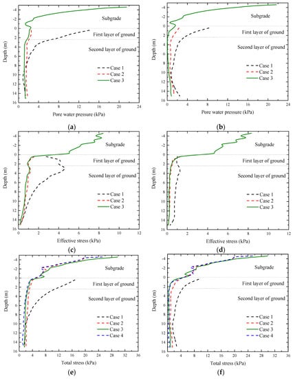 The total stresses in ground in case 2, case 3, and case 4 were much lower than those in case 1. Besides, the total stress exhibited no significant differences between case 2, case 3, and case 4, indicating that the total stress was less influenced by the dry or saturated condition. When the piles were considered, the total stress in subgrade had no obvious difference, but the total stress in ground was reduced, as shown in Figure 13e,f.