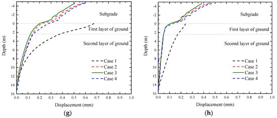 The displacement in saturated soils was smaller than that in dry soils by comparing the results from case 2 and case 3, as shown in Figure 13g. Note that the maximum displacement of ground occurred in case 1 because of the lack of subgrade. The piles could also significantly reduce the displacement, as shown in Figure 13h.