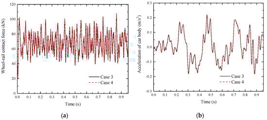In order to investigate the influence of water on the train-track dynamic interactions, the wheel-rail contact force and the acceleration of the car body were obtained from case 3 and case 4, as shown in Figure 14. There was no noticeable difference between the saturated case (case 3) and dry case (case 4). This was mainly because the undrained water in the soils could not induce a significant change for vibration responses. Therefore the train-track interactions would not change much.