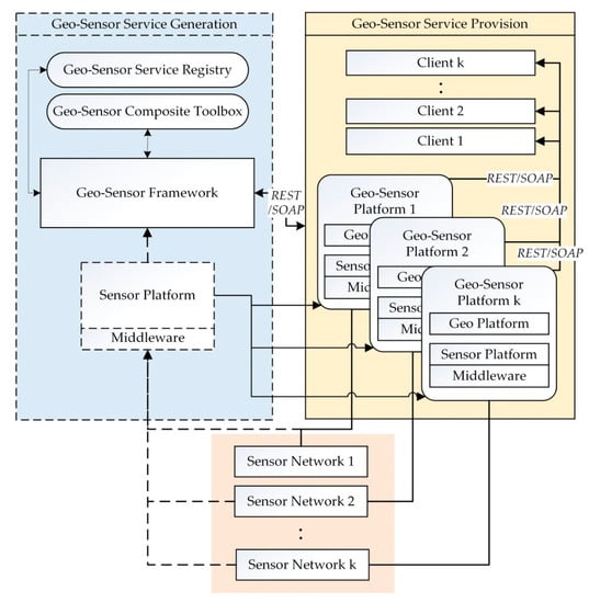 Figure 2 shows the conceptual diagram for the geo-sensor framework for the deployment of multiple platforms. The data collected from the sensor networks is first passed onto the sensor middleware, where the sensor network’s mapping to a dedicated sensor platform is done. Then, the data is passed onto the sensor platform via sensor middleware. Each sensor network’s spatial context is managed at a Geo platform. At the geo-sensor composite toolbox, the assistance for the DIY geo-sensor network’s deployment is provided. Geo-sensor framework integrates the services provided by the geo-sensor composition toolbox and geo-sensor platform to enable the geo-sensor services provision and the network’s visualization for the client end.